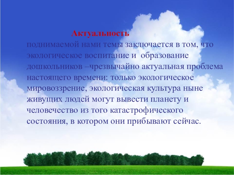 поднимаемой нами темы заключается в том, что экологическое воспитание и образование дошкольников –чрезвычайно актуальная проблема настоящего времени: только экологическое мировоззрение, экологическая культура ныне живущих людей могут вывести планету и человечество из того катастрофического состояния, в котором они прибывают сейчас.