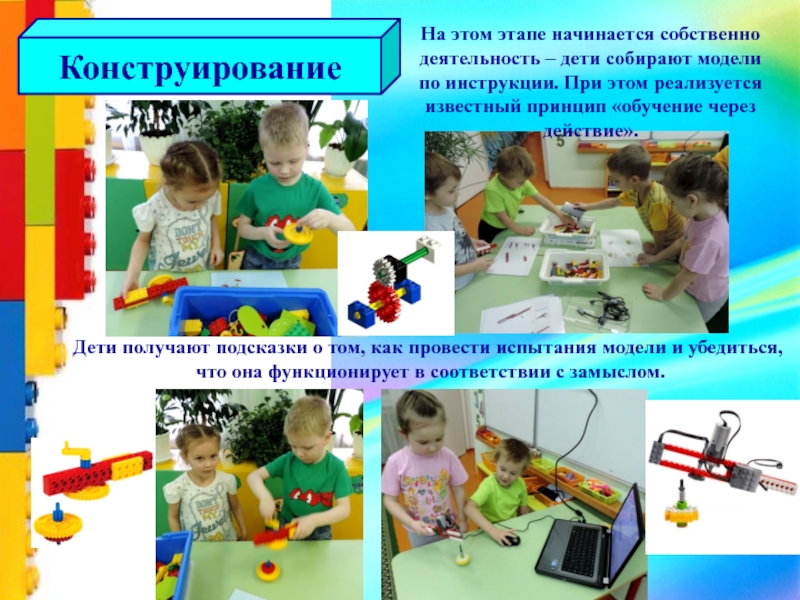 На этом этапе начинается собственно деятельность – дети собирают модели по инструкции. При этом реализуется известный принцип «обучение через действие».
