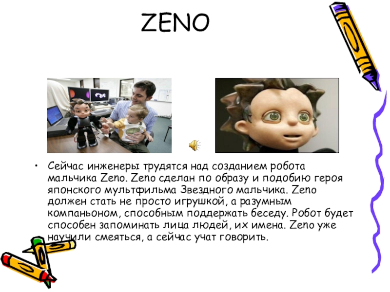ZENOСейчас инженеры трудятся над созданием робота мальчика Zeno. Zeno сделан по образу и подобию героя японского мультфильма
