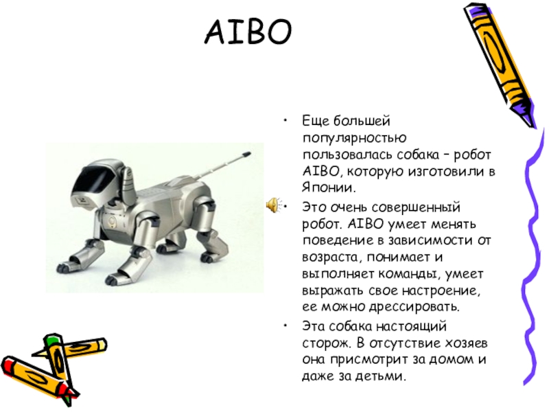 AIBOЕще большей популярностью пользовалась собака – робот AIBO, которую изготовили в Японии. Это очень совершенный робот. AIBO