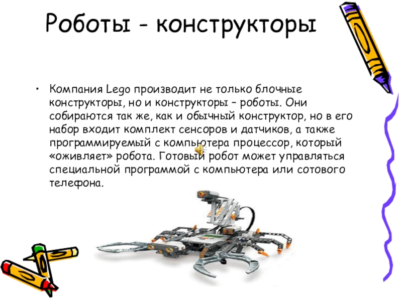 Роботы - конструкторыКомпания Lego производит не только блочные конструкторы, но и конструкторы – роботы. Они собираются так
