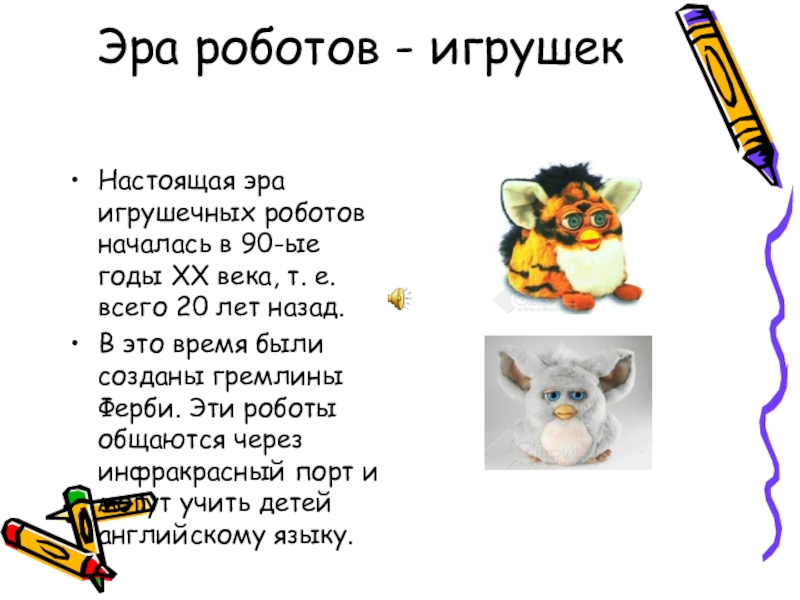 Эра роботов - игрушекНастоящая эра игрушечных роботов началась в 90-ые годы XX века, т. е. всего 20