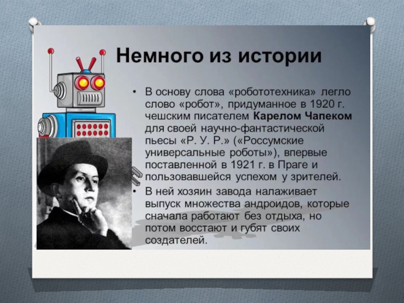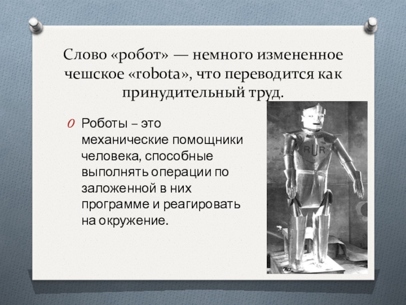 Роботы – это механические помощники человека, способные выполнять операции по заложенной в них программе и реагировать на окружение.