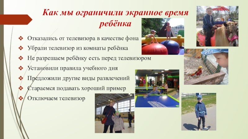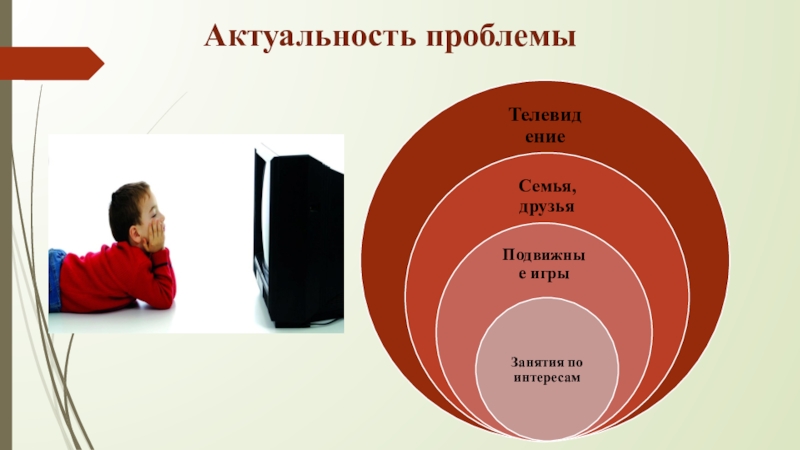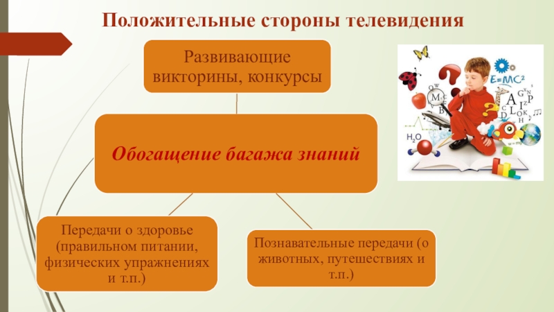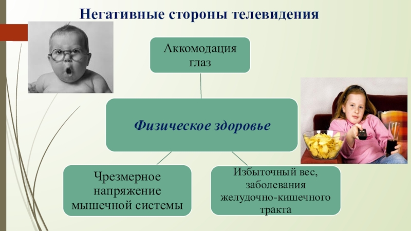главным центром притяжения. Он становится для ребёнка закадычным другом, который ежедневно развлекает его, снабжает различной информацией. Педагоги и психологи не пришли к единому мнению, является ли телевидение общественно вредным явлением. Тем не менее на лицо бесспорный факт: часы, проведенные перед экраном телевизора, ребёнок мог бы посвятить другим, гораздо более полезным занятиям.