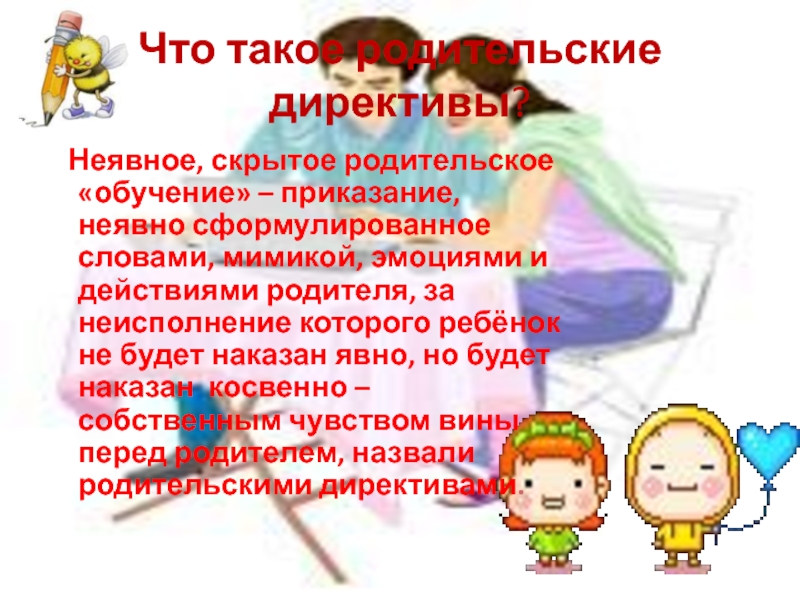 В.К. Лосева и А.И. Луньков дают понятие «родительские директивы», введенное прсихотерапевтами Робертом и Мэри Гулдингами и связывают его с нашим поведением в повседневной жизни.