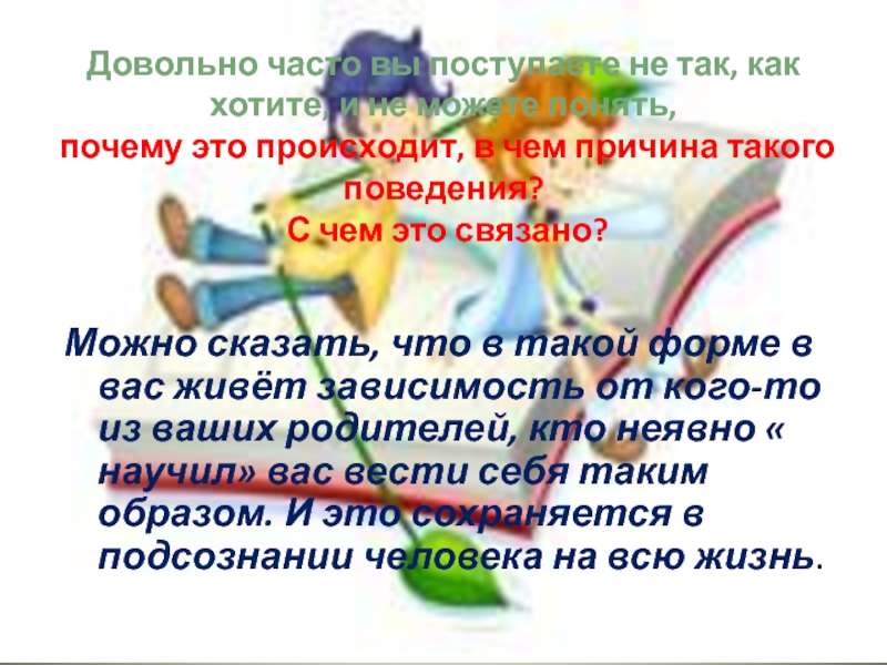 Подсознательное решение: «Я не имею права стать настолько самостоятельным, чтобы жить без материнской поддержки».