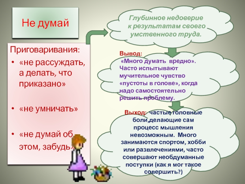 «Много думать вредно». Часто испытывают мучительное чувство «пустоты в голове», когда надо самостоятельно решить проблему.