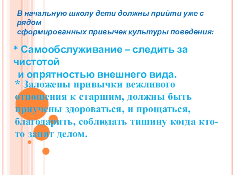 * Заложены привычки вежливого отношения к старшим, должны быть приучены здороваться, и прощаться, благодарить, соблюдать тишину когда кто-то занят делом.