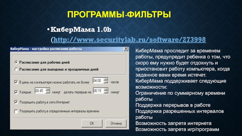 КиберМама проследит за временем работы, предупредит ребенка о том,