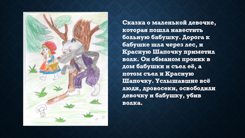 Слайд 5Сказка о маленькой девочке, которая пошла навестить больную бабушку. Дорога к