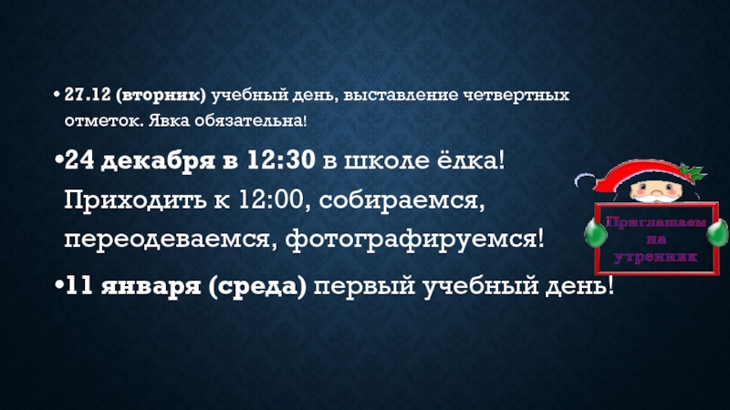 Слайд 1627.12 (вторник) учебный день, выставление четвертных отметок. Явка обязательна!