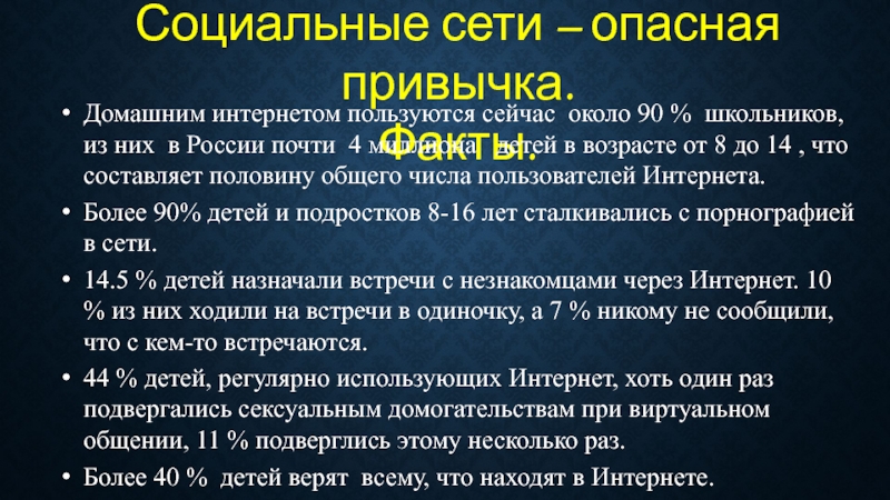 44 % детей, регулярно использующих Интернет, хоть один раз подвергались сексуальным домогательствам при виртуальном общении, 11 % подверглись этому несколько раз.
