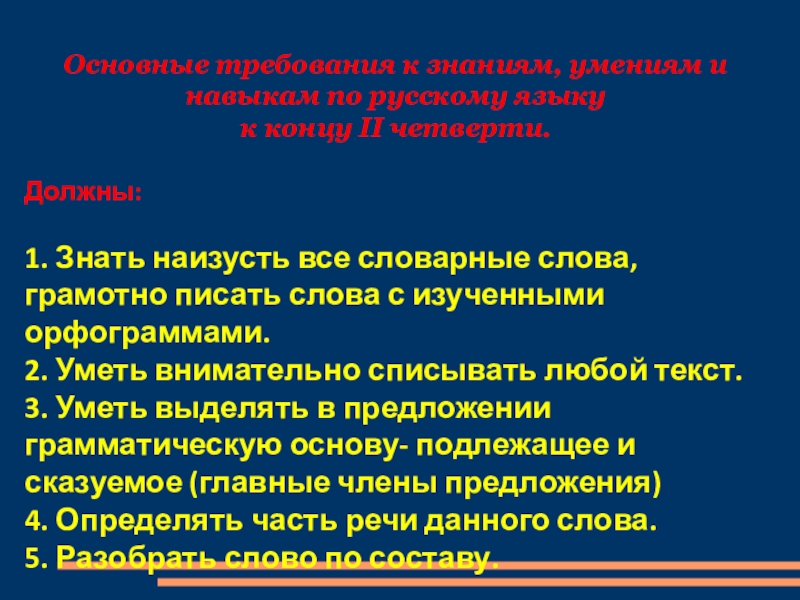 Слайд 14Основные требования к знаниям, умениям и навыкам по русскому языку