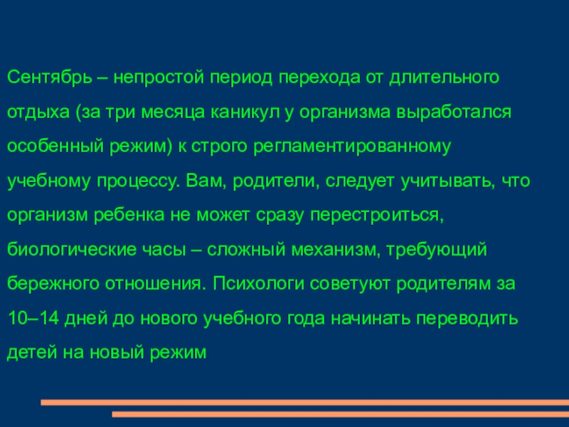 Слайд 4Сентябрь – непростой период перехода от длительного отдыха (за три месяца