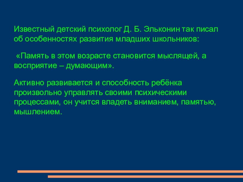 Слайд 7Известный детский психолог Д. Б. Эльконин так писал об особенностях развития