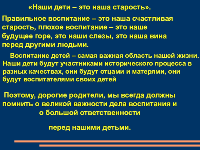 Поэтому, дорогие родители, мы всегда должны помнить о великой важности дела воспитания и о большой ответственности