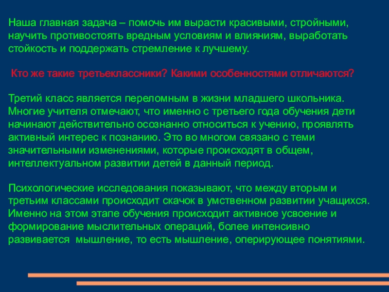 Психологические исследования показывают, что между вторым и третьим классами происходит скачок в умственном развитии учащихся. Именно на этом этапе обучения происходит активное усвоение и формирование мыслительных операций, более интенсивно развивается мышление, то есть мышление, оперирующее понятиями.