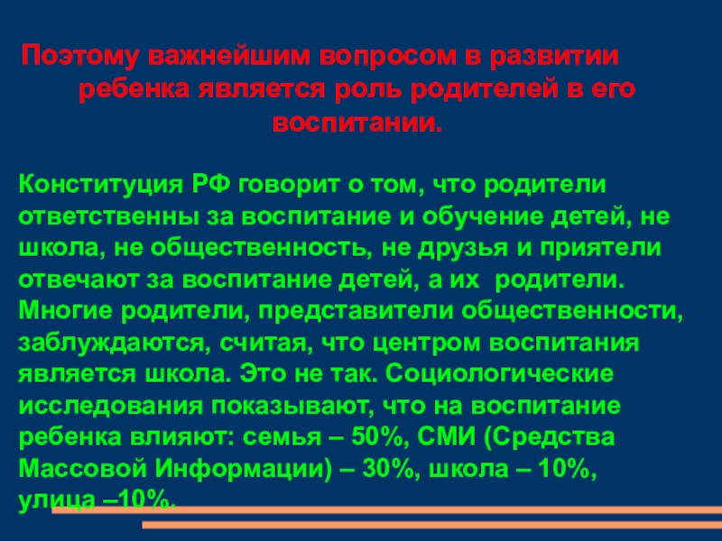 Конституция РФ говорит о том, что родители ответственны за воспитание и обучение детей, не школа, не общественность, не друзья и приятели отвечают за воспитание детей, а их родители. Многие родители, представители общественности, заблуждаются, считая, что центром воспитания является школа. Это не так. Социологические исследования показывают, что на воспитание ребенка влияют: семья – 50%, СМИ (Средства Массовой Информации) – 30%, школа – 10%, улица –10%.