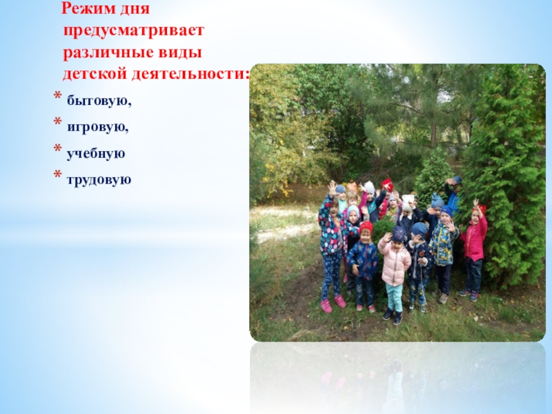 Слайд 7Режим дня предусматривает различные виды детской деятельности:
