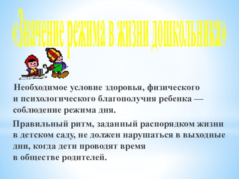 Правильный ритм, заданный распорядком жизни в детском саду, не должен нарушаться в выходные дни, когда дети проводят время
