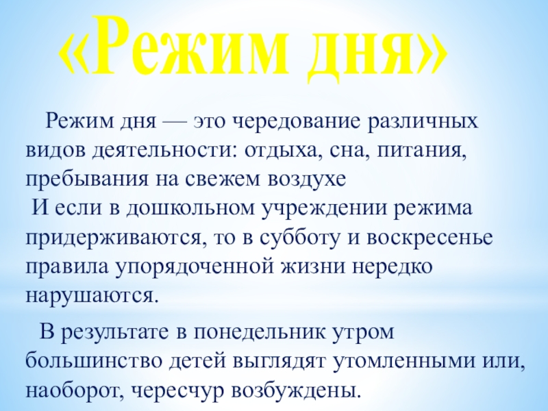 И если в дошкольном учреждении режима придерживаются, то в субботу и воскресенье правила упорядоченной жизни нередко нарушаются.