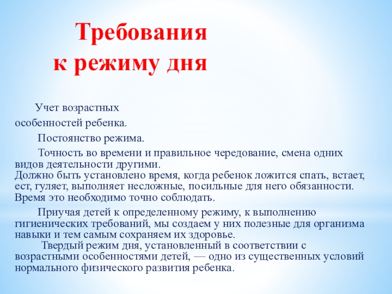Твердый режим дня, установленный в соответствии с возрастными особенностями детей, — одно из существенных условий нормального физического развития ребенка.