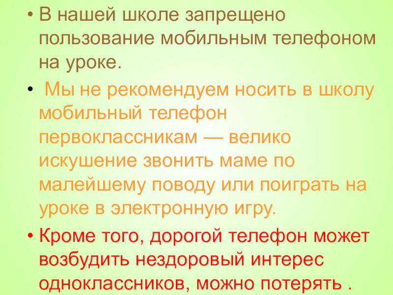 рекомендуем носить в школу мобильный телефон первоклассникам — велико искушение звонить маме по малейшему поводу или поиграть на уроке в электронную игру.