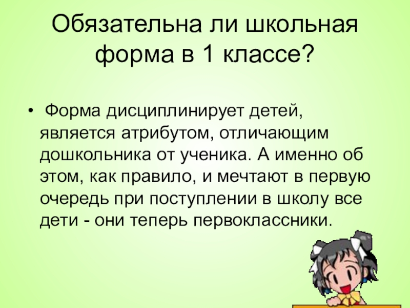 Слайд 9Обязательна ли школьная форма в 1 классе?