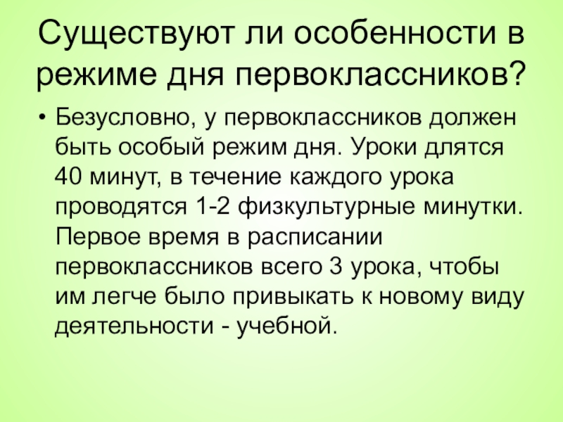 особый режим дня. Уроки длятся 40 минут, в течение каждого урока проводятся 1-2 физкультурные минутки. Первое время в расписании первоклассников всего 3 урока, чтобы им легче было привыкать к новому виду деятельности - учебной.