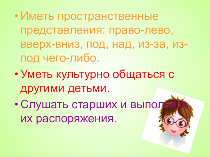 Слайд 7Иметь пространственные представления: право-лево,