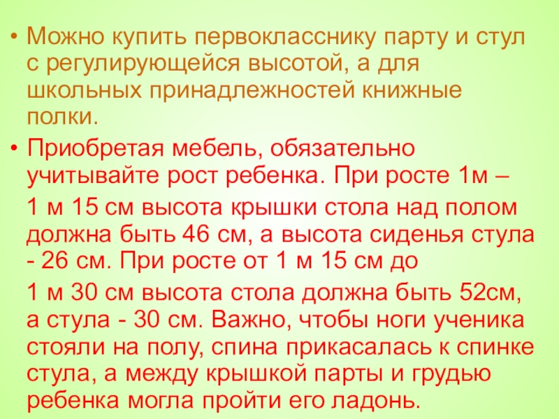 Слайд 24Можно купить первокласснику парту и стул с регулирующейся высотой, а для