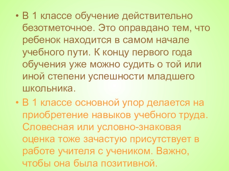 Слайд 18В 1 классе обучение действительно безотметочное. Это оправдано тем, что ребенок