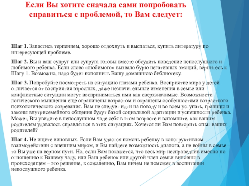 Шаг 4. Не ищите виновных. Если Вам удастся помочь ребенку в конструктивном взаимодействии с внешним миром, и Вы найдете возможность диалога, а не войны в семье – то Вы уже на верном пути. Но, если Вам покажется, что весь мир несправедлив именно по отношению к Вашему чаду, или Ваш ребенок или другой член семьи виновны в происходящем – это решение, к сожалению, Вам ничем не поможет в воспитании непослушного ребенка.