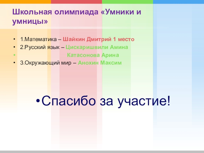 Слайд 10Школьная олимпиада «Умники и умницы»