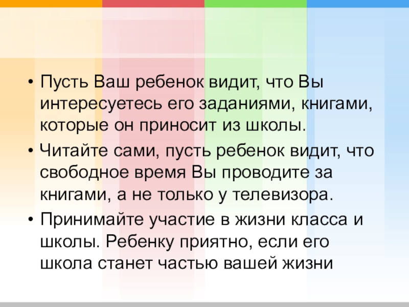 Пусть Ваш ребенок видит, что Вы интересуетесь его заданиями, книгами, которые
