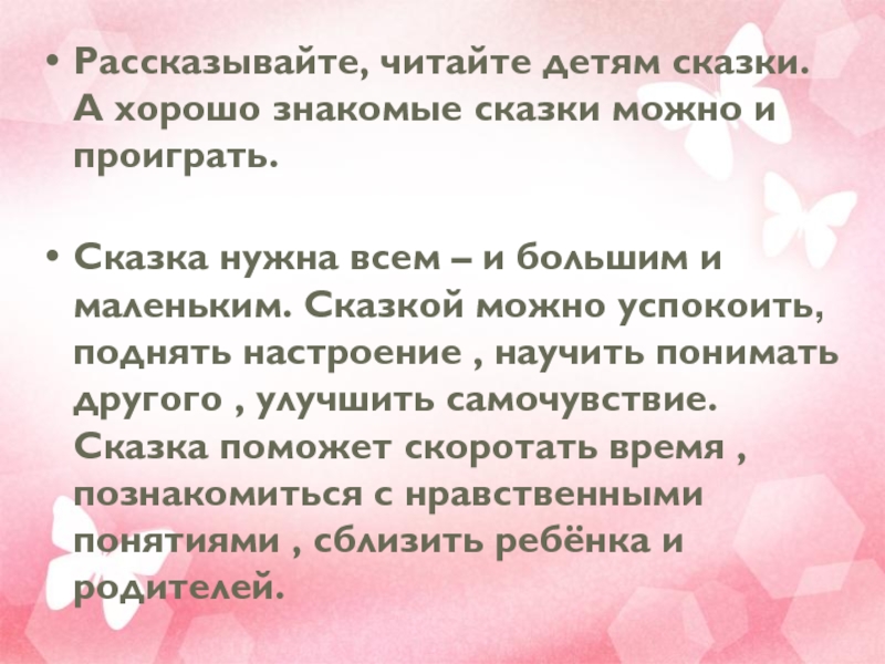 нужна всем – и большим и маленьким. Сказкой можно успокоить, поднять настроение , научить понимать другого , улучшить самочувствие. Сказка поможет скоротать время , познакомиться с нравственными понятиями , сблизить ребёнка и родителей.