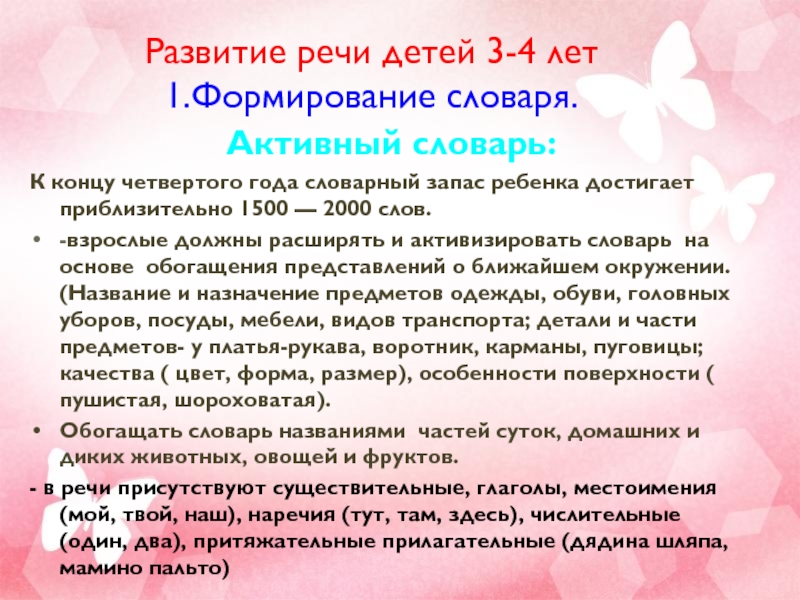 К концу четвертого года словарный запас ребенка достигает приблизительно 1500 — 2000 слов.