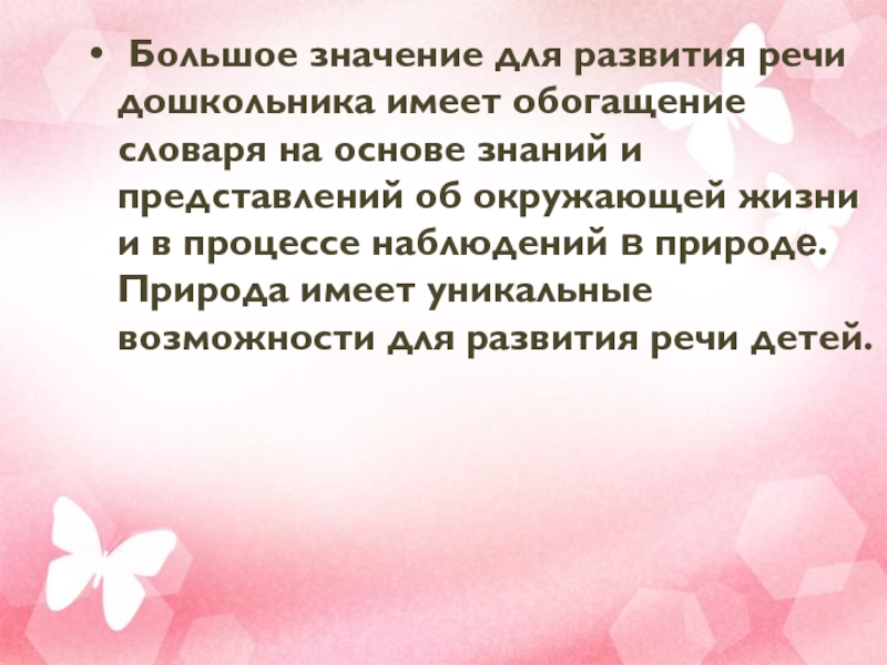 основе знаний и представлений об окружающей жизни и в процессе наблюдений в природе. Природа имеет уникальные возможности для развития речи детей.