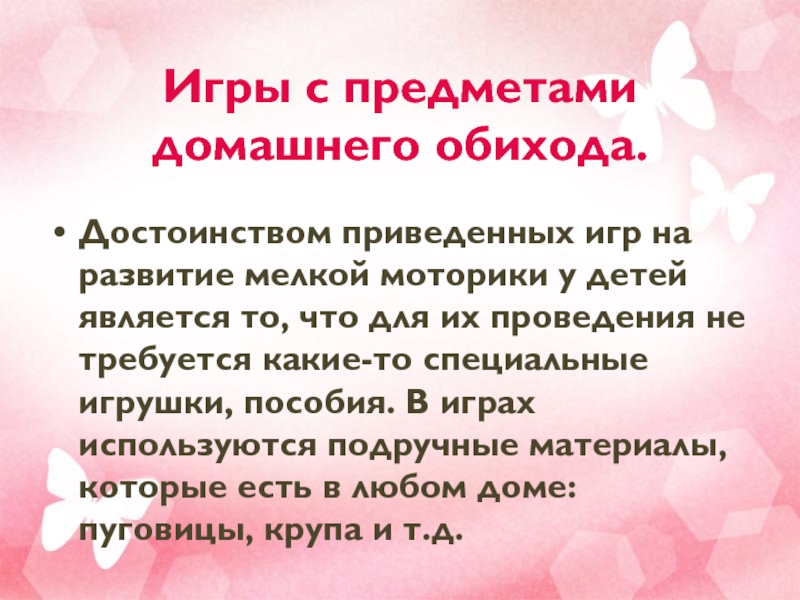 у детей является то, что для их проведения не требуется какие-то специальные игрушки, пособия. В играх используются подручные материалы, которые есть в любом доме: пуговицы, крупа и т.д.
