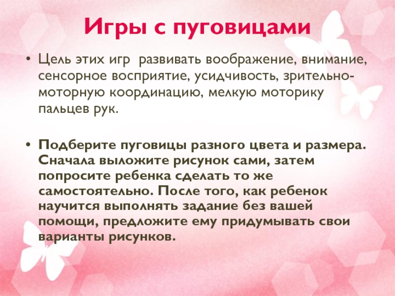 Цель этих игр развивать воображение, внимание, сенсорное восприятие, усидчивость, зрительно-моторную