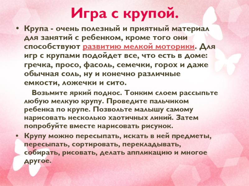 Крупу можно пересыпать, искать в ней предметы, пересыпать, сортировать, перекладывать, собирать, рисовать, делать аппликацию и многое другое.