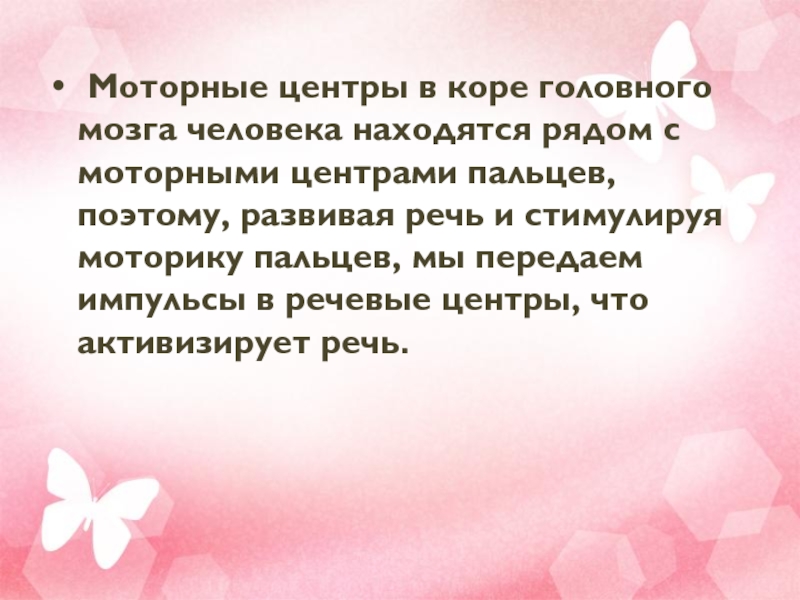 с моторными центрами пальцев, поэтому, развивая речь и стимулируя моторику пальцев, мы передаем импульсы в речевые центры, что активизирует речь.