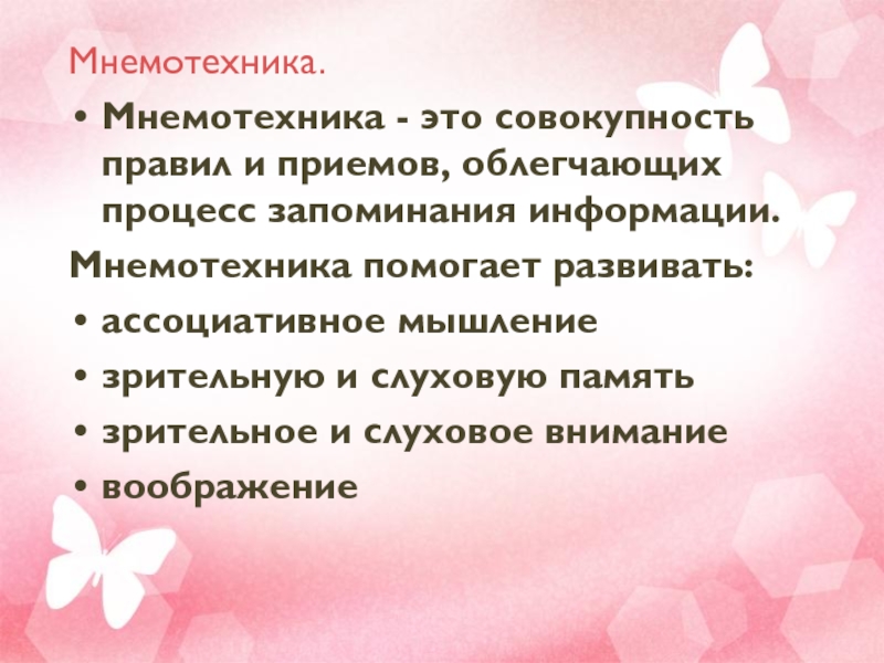Мнемотехника - это совокупность правил и приемов, облегчающих процесс запоминания информации.