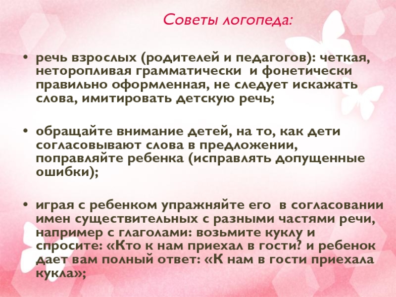 обращайте внимание детей, на то, как дети согласовывают слова в предложении, поправляйте ребенка (исправлять допущенные ошибки);