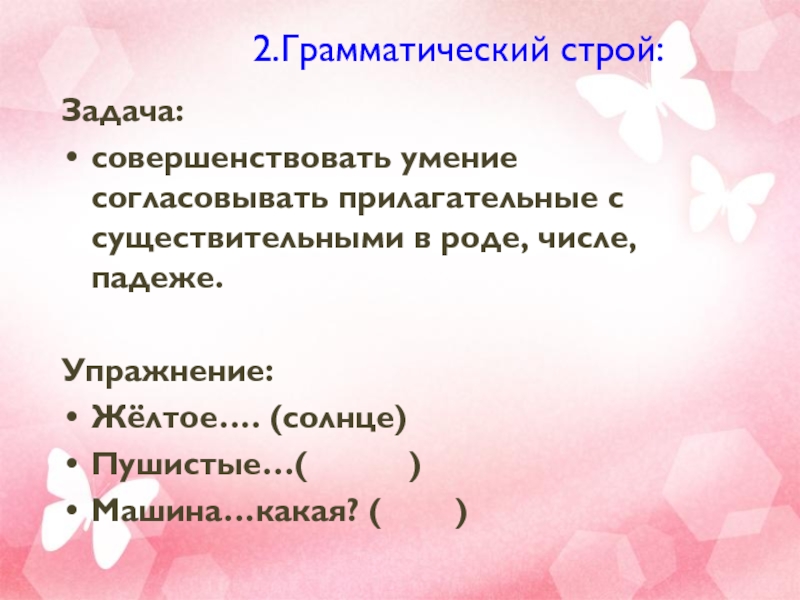 совершенствовать умение согласовывать прилагательные с существительными в роде, числе, падеже.