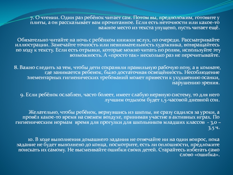 Слайд 4 7. О чтении. Один раз ребёнок читает сам. Потом вы,