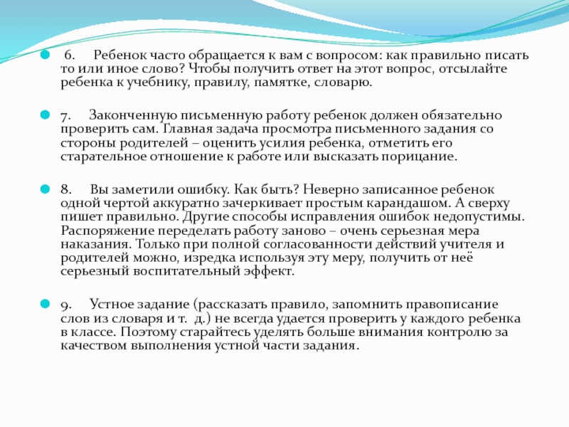 9. Устное задание (рассказать правило, запомнить правописание слов из словаря и т. д.) не всегда удается проверить у каждого ребенка в классе. Поэтому старайтесь уделять больше внимания контролю за качеством выполнения устной части задания.