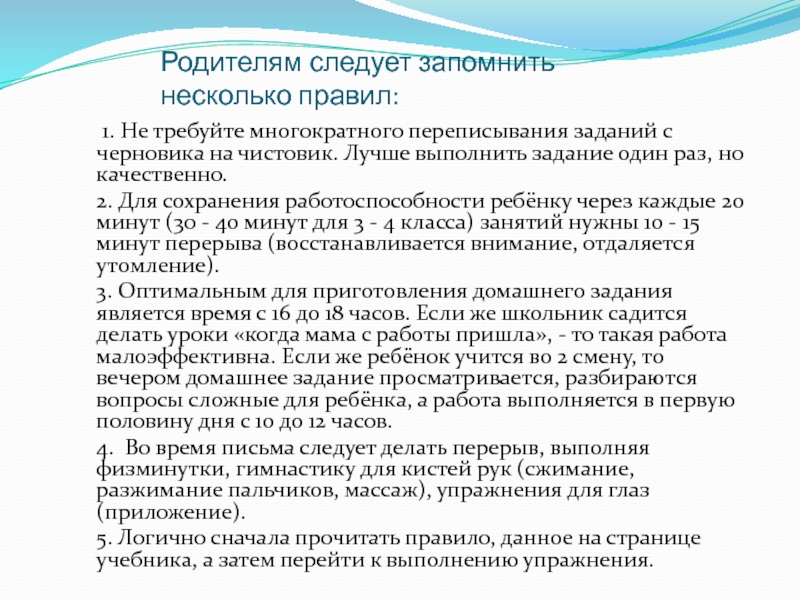 5. Не торопитесь помогать ребенку. В случае затруднения будет правильнее сказать: «Посиди, подумай, обратись к правилу, а если не выполнишь, могу помочь. Но все-таки лучше тебе обратиться завтра к учителю».