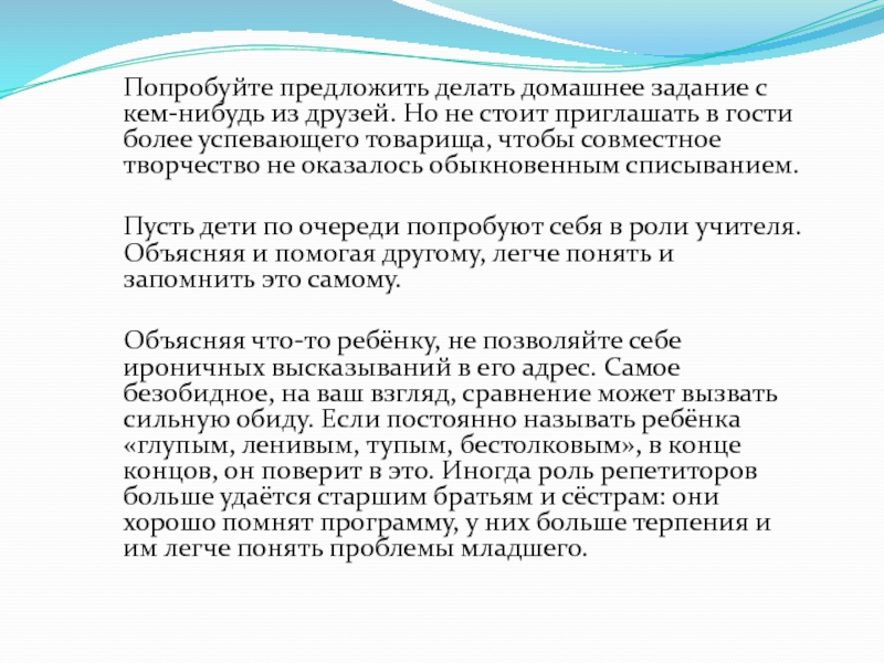 Слайд 10Попробуйте предложить делать домашнее задание с кем-нибудь из друзей. Но не