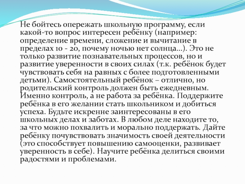 определение времени, сложение и вычитание в пределах 10 - 20, почему ночью нет солнца…). Это не только развитие познавательных процессов, но и развитие уверенности в своих силах (т.к. ребёнок будет чувствовать себя на равных с более подготовленными детьми). Самостоятельный ребёнок – отлично, но родительский контроль должен быть ежедневным. Именно контроль, а не работа за ребёнка. Поддержите ребёнка в его желании стать школьником и добиться успеха. Будьте искренне заинтересованы в его школьных делах и заботах. В любом деле находите то, за что можно похвалить и морально поддержать. Дайте ребёнку почувствовать значимость своей деятельности (это способствует повышению самооценки, развивает уверенность в себе). Научите ребёнка делиться своими радостями и проблемами.